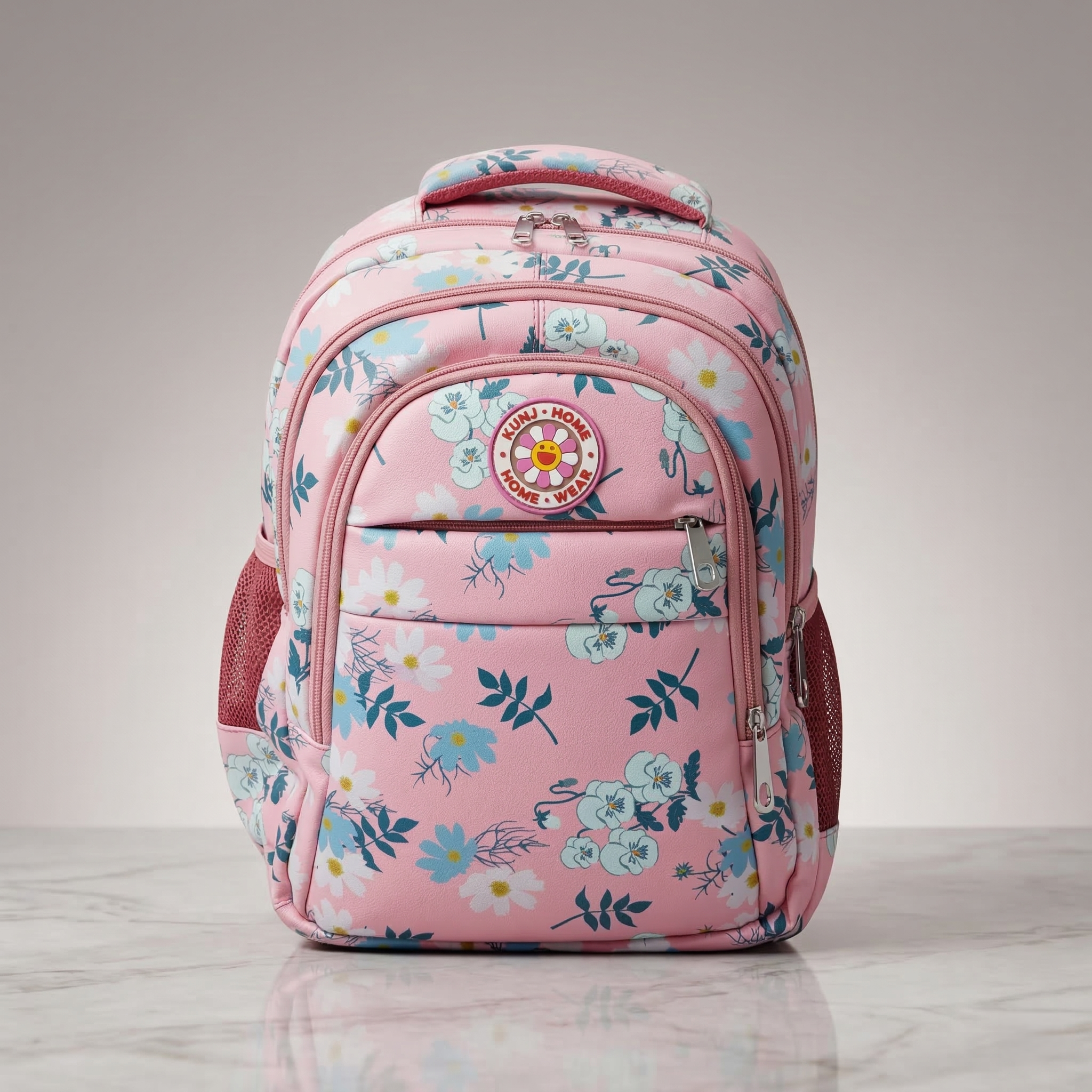 ব্যাগের সামনে একটি ছোট চেইনযুক্ত পকেট আছে এবং দুই পাশে পানির বোতল রাখার জন্য জালের (Mesh) পকেট দেওয়া হয়েছে।